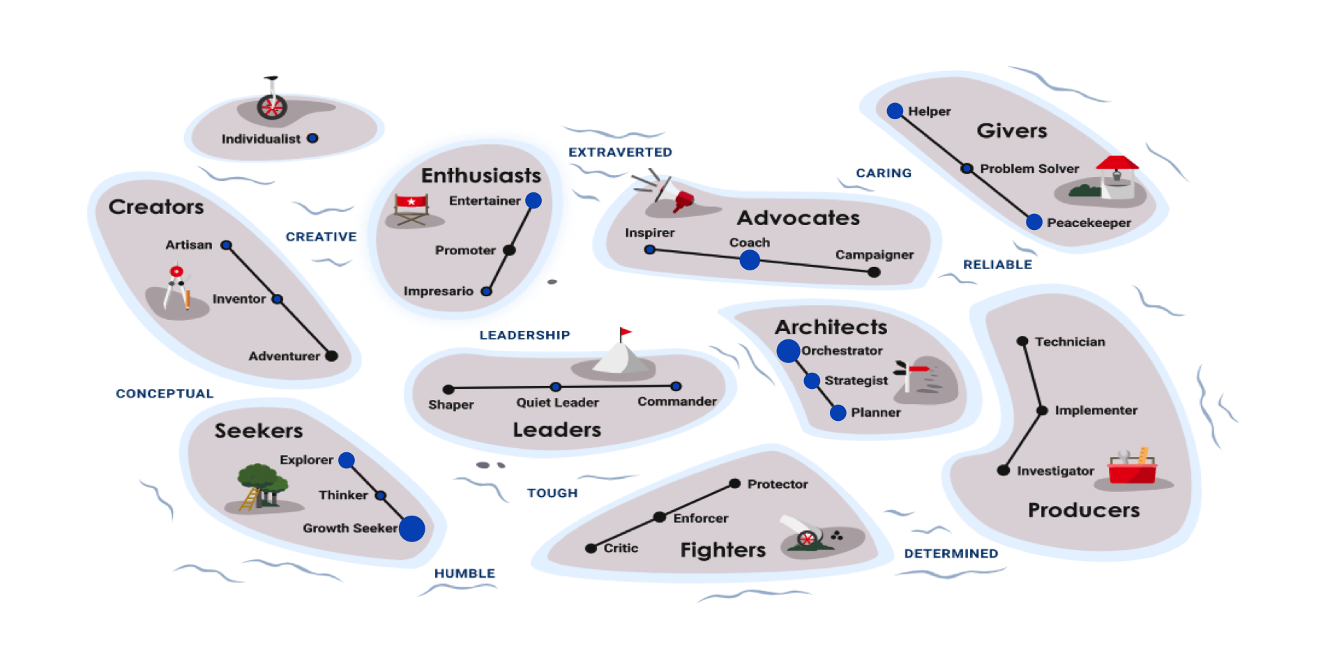 Creative measures how people like to think and innovate, as well as the kind of environment they prefer. It is comprised of three facets: Originality, Curiosity, and Nonconformity.